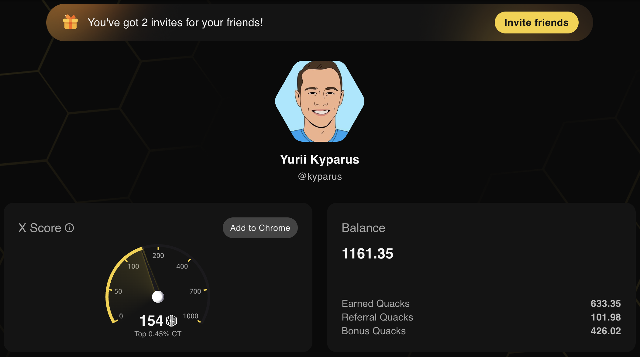 - Quacks Balance: The number of Quacks (points) you’ve earned based on your contributions.